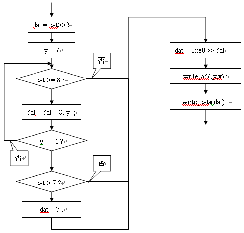 ?????? GDM12864A是一個具有128點x 64點的點陣LCD。根據(jù)所選的LCD的特點,Y軸上只有64個點,所以能顯示的數(shù)據(jù)范圍為0到63而采樣得到的數(shù)據(jù)為8位的二進制數(shù)據(jù)為0到255。為了能在這個LCD上顯示只取8位數(shù)據(jù)的高6位。那么如何把這高6位的二進制數(shù)據(jù)轉換成在LCD上的Y軸座標和數(shù)據(jù)值呢?我想了這樣一個計算的方法: