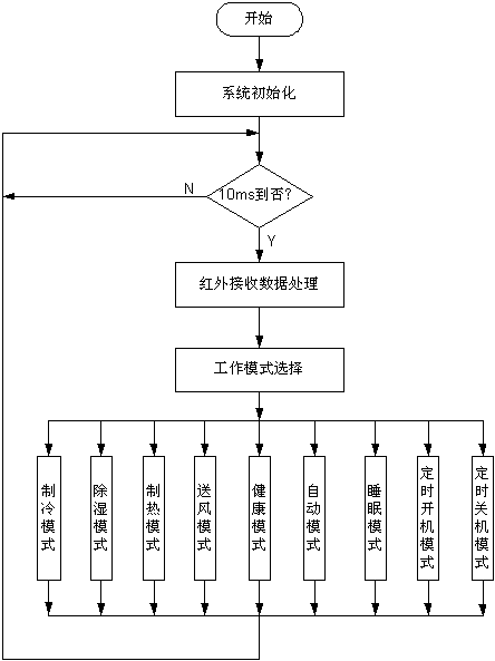 首先等待10ms的到來(lái),10ms來(lái)臨,進(jìn)行遙控器信號(hào)的解碼,根據(jù)解碼得到的信息選擇空調(diào)的工作模式,然后進(jìn)入該模式執(zhí)行。