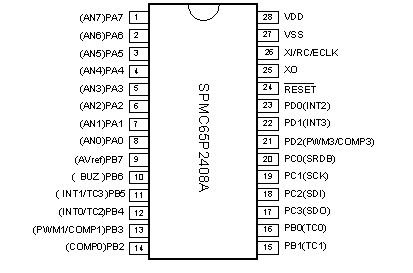 SPMC65P2408A是由凌陽(yáng)公司設(shè)計(jì)開(kāi)發(fā)的8位工業(yè)級(jí)單片機(jī),采用凌陽(yáng)SPMC65內(nèi)核,支持位操作指令。具有強(qiáng)大的定時(shí)/計(jì)數(shù)器、豐富的外部中斷源以及ADC、PWM、標(biāo)準(zhǔn)通訊接口等多種功能。適用于通用工控場(chǎng)合、計(jì)算機(jī)外圍控制和家電等。SPMC65P2408A有28管腳和32管腳兩種封裝,32管腳封裝多了UART功能。本設(shè)計(jì)選用28管腳封裝,如圖4-2所示。