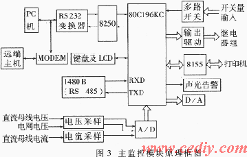 獨立的模塊,可監(jiān)控整個電源系統(tǒng)的工作狀態(tài),控制各模塊的投入和退出,完成人機對話,實現(xiàn)與外部PC或遠端主機的通信?! D3是該模塊的原理框圖。系統(tǒng)采用Intel公司的80C196KC作主控制器,用本身