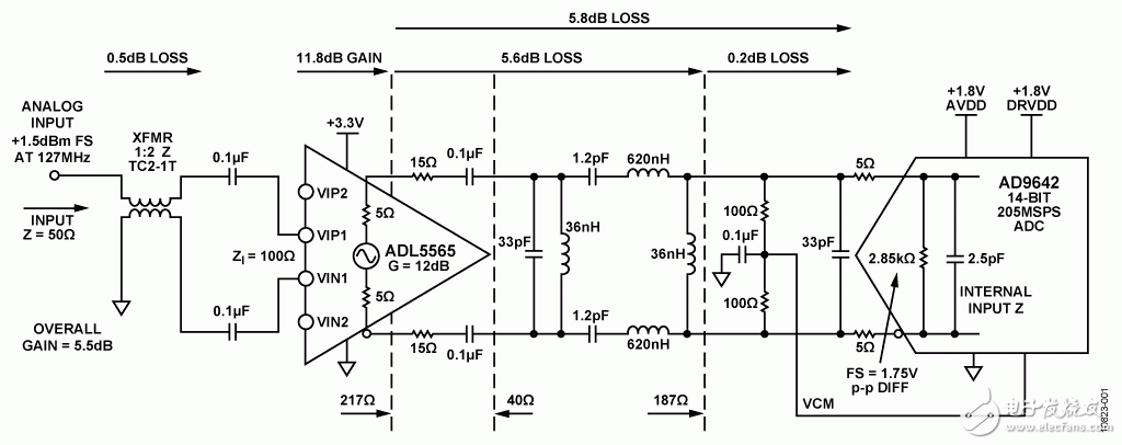 10 圖1中的電路是基于 ADL5565 超低噪聲差分放大器驅(qū)動器和 AD9642 14位、250 MSPS模數(shù)轉(zhuǎn)換器(ADC)的窄帶通接收機前端。三階巴特沃茲抗混疊濾波器基于放大器和ADC的性能和接口