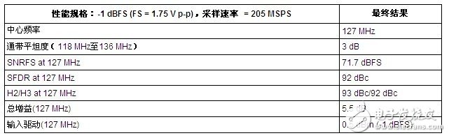 4 沃茲抗混疊濾波器基于放大器和ADC的性能與接口要求而優(yōu)化。由濾波器網(wǎng)絡(luò)和其它阻性元件引起的總插入損耗約為2.3dB。整體電路(集成帶通濾波器)擁有75 MHz的1dB帶寬(145 MHz至220 MHz)和110