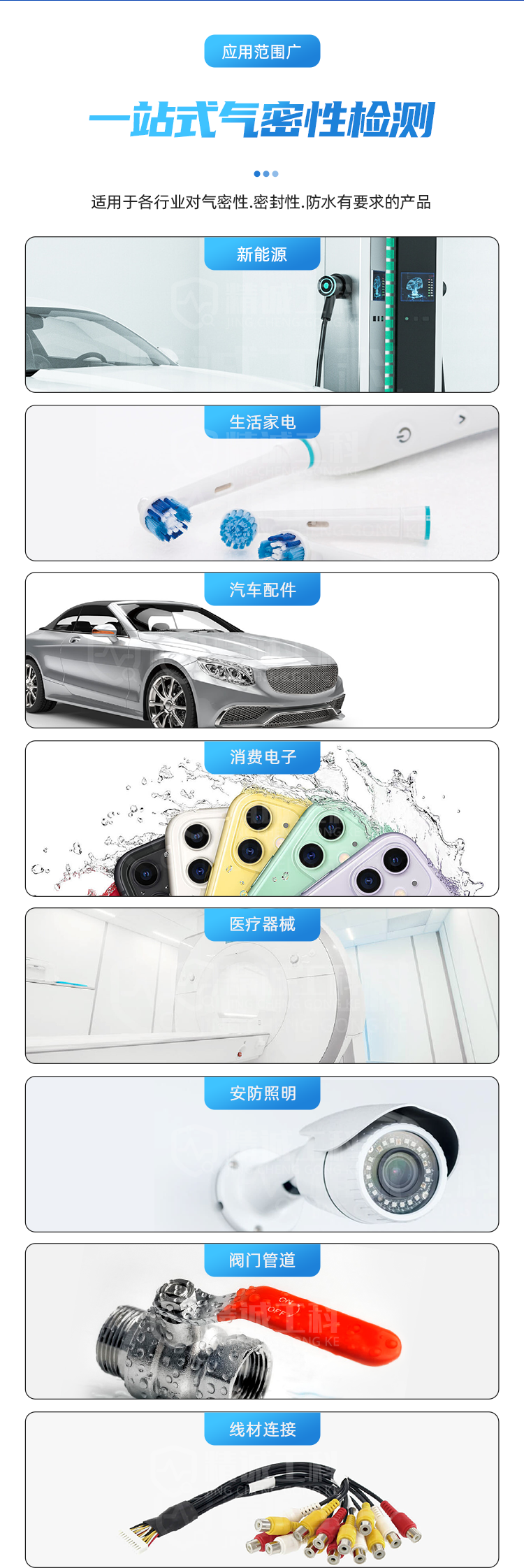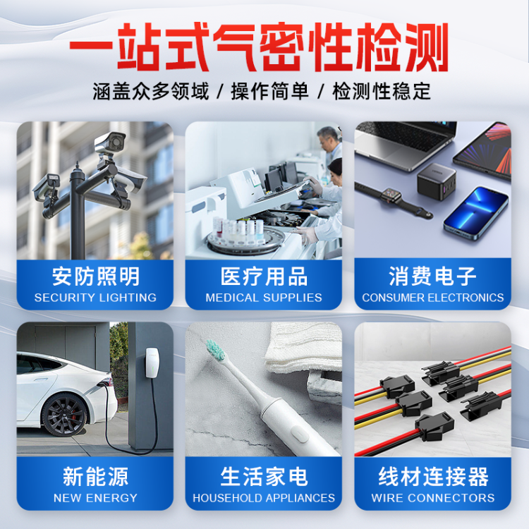 ? 安防照明:LED 燈、室外攝像頭、倒車影像、智能門鎖、對講機、三防手機、戶外控測器、水下報警器、戶外燈具、水下照明燈等都需要進行氣密性檢測。