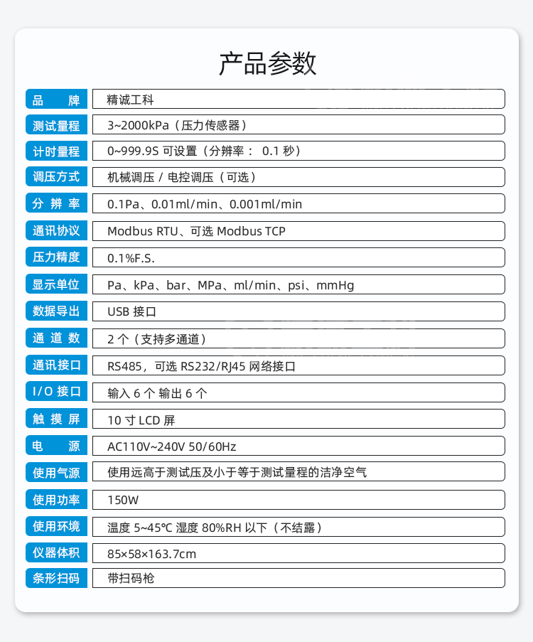 產(chǎn)品型號:JC-WG200 流量量程:0.1~50000ml/min 壓力量程:3~500kPa 分辨率:1Pa 壓力精度:0.2%.F.S. 測試單位:ml/min、kPa -