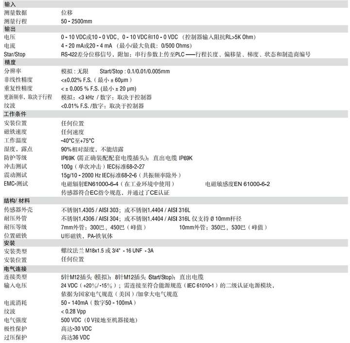 產(chǎn)品型號:RS防水型 信號:電流,電壓,SSI,CANbus和Profibus總線 工作溫度:-40~75℃ 溫度系數(shù):<30ppm/℃ 外殼:不銹鋼303/304 -