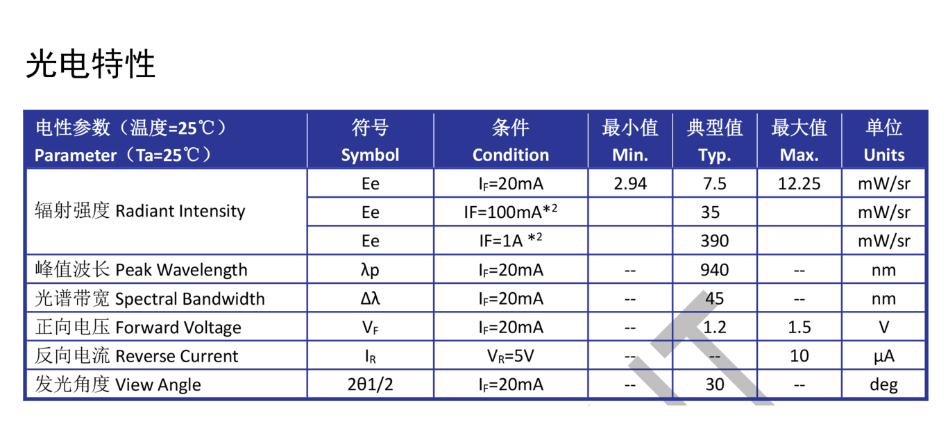 產(chǎn)品型號:ZIR0342C 規(guī)格:3.2*2.2 mm 功率:150 mW 峰值波長:940 nm 工作溫度:- 25~+85℃ -