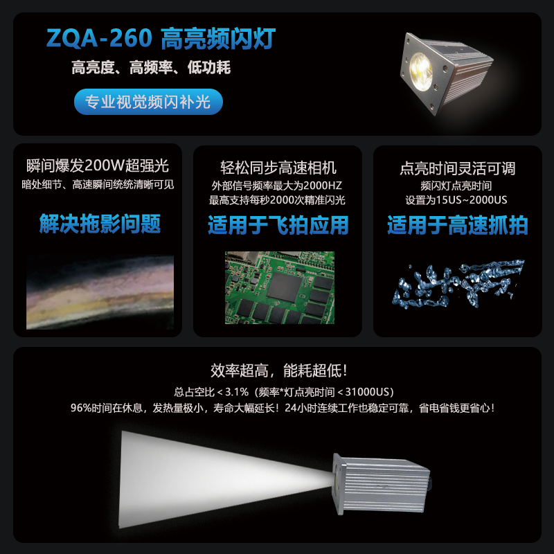 ZQA-260 是專為機(jī)器視覺行業(yè)研制的高亮頻閃LED光源,他體積小,重量輕,內(nèi)部采用200W高亮LED,最高頻率可達(dá)2000Hz。
