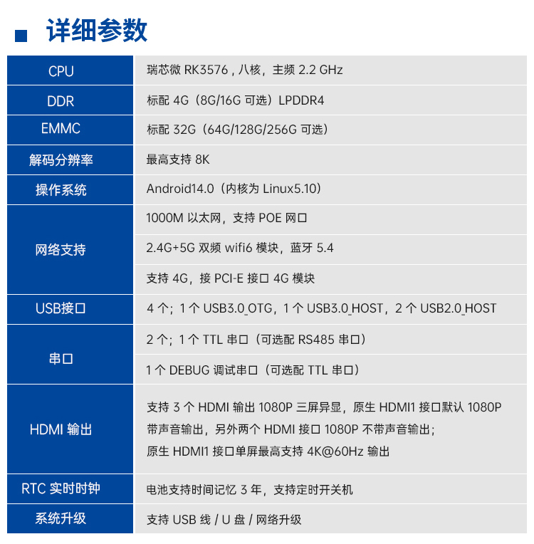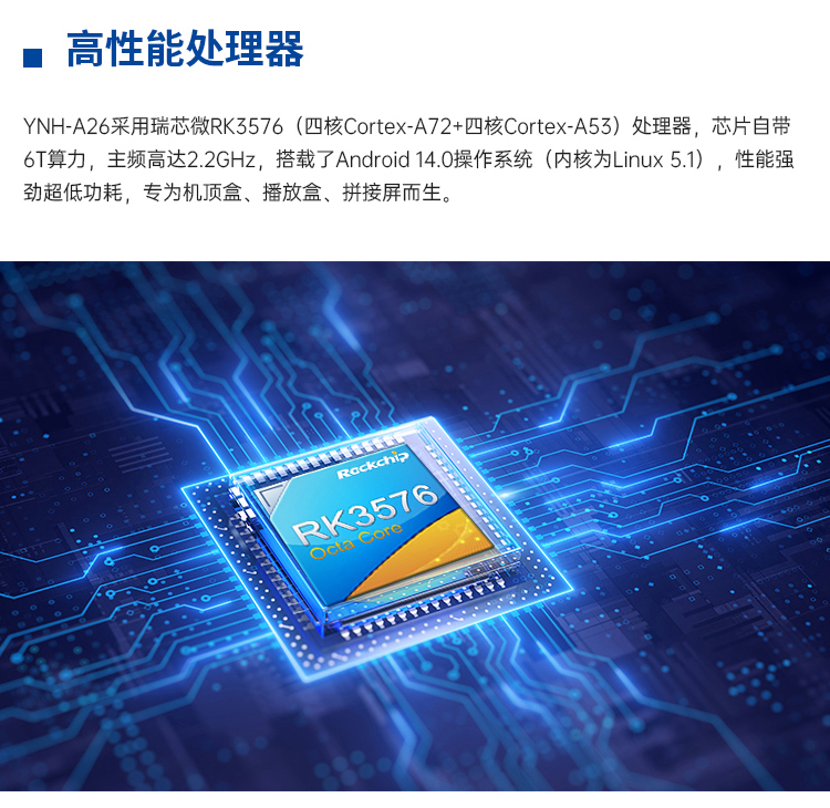 YNH-A26 采用瑞芯微 RK3576 高性能八核 ARM64 位處理器,頻率高達(dá) 2.2GHz,芯片自帶 6TOPS 算力 NPU,搭載 Android14.0 系統(tǒng)(內(nèi)核為L(zhǎng)inux5.10),GPU 采用 ARM G52 MC3,性能突出,性價(jià)比高。支持 8K視頻編解碼,4K 顯示輸出,內(nèi)置多種顯示接口,支持多屏異顯;豐富的高速接口(PCI-E, 千兆以太網(wǎng)),易于擴(kuò)展。支持多款外設(shè)擴(kuò)展,是您在機(jī)頂盒、多媒體播放盒行業(yè)最佳的選擇。