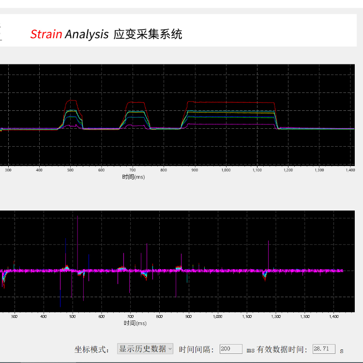 ◆ 多通道同步:單通道最高 10kHz 采樣率,實時同步顯示波形與數(shù)值,直觀分析應(yīng)變差異。