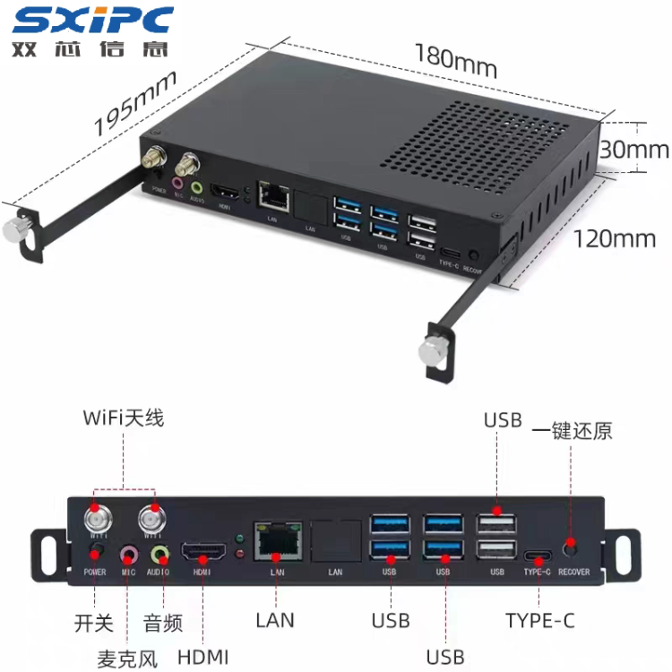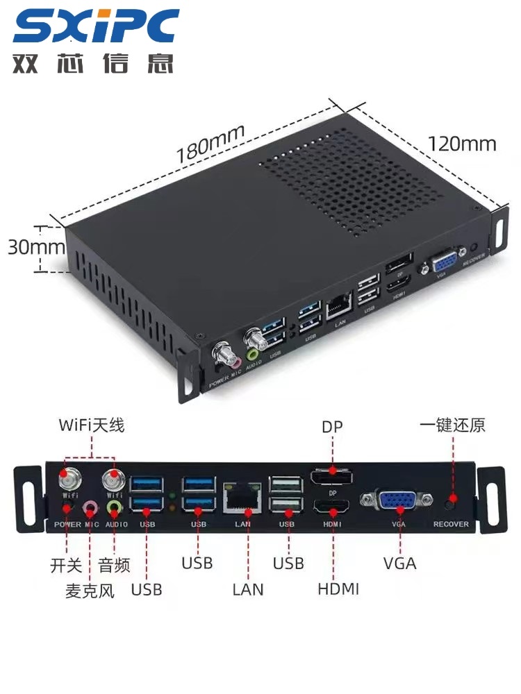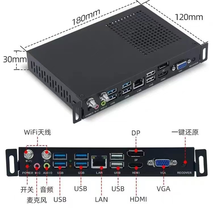 產(chǎn)品前面接口豐富,依次配備 DC 電源接口(采用 12V/19V 電源適配器供電)、MIC 接口(連接耳機麥克風等)、3.5MM 音頻接口(連接耳機或音響)、LAN 網(wǎng)口(RJ-45 網(wǎng)絡(luò)接口)、VGA 視頻接口(輸出模擬信號)、DP 視頻接口(數(shù)字式接口,支持音頻等數(shù)據(jù)傳輸)、HDMI 視頻接口(同時傳輸音視頻信號),以及多個 USB 接口(含 USB3.0 和 USB2.0,分別支持不同讀取速度)和一鍵還原按鈕(可恢復系統(tǒng)至出廠狀態(tài))。