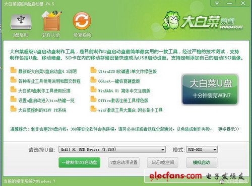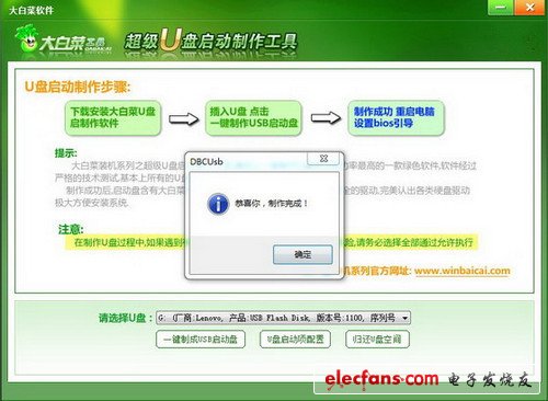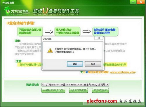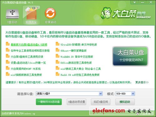 啟動(dòng)軟件后,請(qǐng)插入你的U盤,請(qǐng)注意U盤有數(shù)據(jù)的請(qǐng)先備份一下,等制作完后再拷回,大白菜U盤工具會(huì)格式化你的U盤,制作成功后你的U盤會(huì)減少一百M(fèi)左右做為了隱藏分區(qū),這就是大白菜系統(tǒng)啟動(dòng)文件占用的,正常你看到就是一個(gè)空白U盤。也完可以當(dāng)正常U盤使用,有用戶制作完成后說沒有發(fā)現(xiàn)U盤里有文件,這不是錯(cuò)誤,因?yàn)閱?dòng)文件是自動(dòng)隱藏,正常是看不到也不會(huì)被病毒破壞!