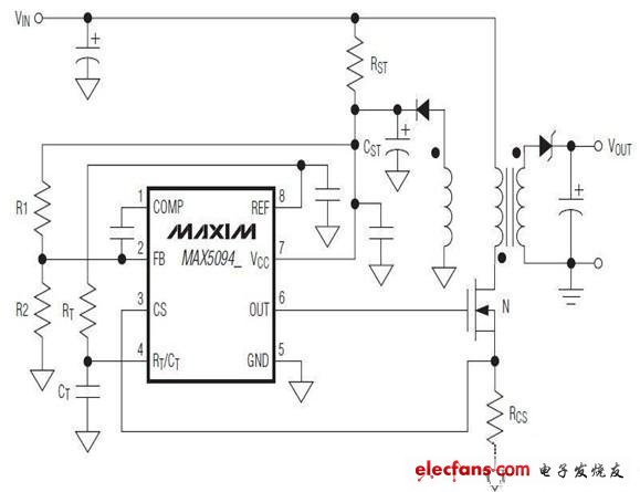 ??? MAX5094 CMOS、高性能、電流模式PWM控制器具有寬輸入電壓范圍隔離/非隔離電源所需的所有特性。這些控制器非常適用于低功率和大功率通用電源及電信電源。MAX5094含有一個(gè)快速比較器,從電流檢測(cè)端到輸出的延時(shí)通常僅為60ns,用于過(guò)流保護(hù)功能。MAX5094內(nèi)置一個(gè)誤差放大器,在COMP端產(chǎn)生輸出。采用外部元件控制COMP電壓的上升可以實(shí)現(xiàn)軟啟動(dòng)。通過(guò)外部電阻和電容可以調(diào)節(jié)振蕩器的頻率,范圍在20kHz至1MHz之間。定時(shí)電容的放電電流經(jīng)過(guò)了微調(diào),可以在給定頻率下設(shè)定死區(qū)時(shí)間和最大占空比。RTCT端輸出的鋸齒波可以在需要的時(shí)候用來(lái)進(jìn)行斜率補(bǔ)償。