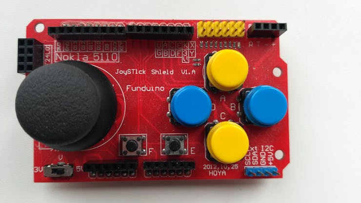 操縱桿盾位于您的 Arduino 頂部,并將其變成一個簡單的控制器。7 個瞬時按鈕(4 個大按鈕、2 個小按鈕和一個操縱桿選擇按鈕)和一個兩軸拇指操縱桿使您的 Arduino 功能達(dá)到舊任天堂控制器的水平。本機(jī)還提供諾基亞 5110 LCD 和 nRF24L01 接口。