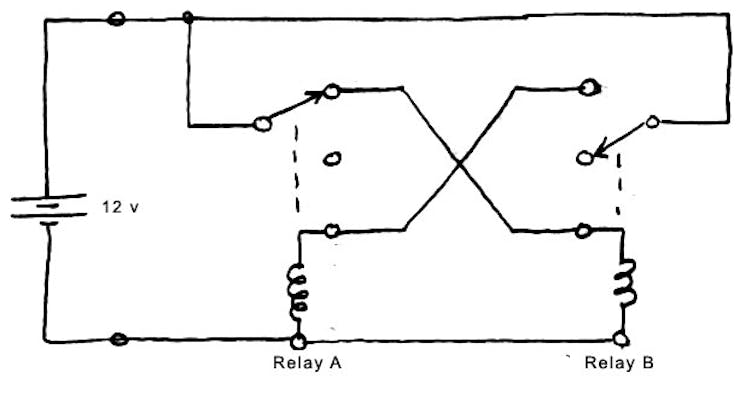 正如我們已經(jīng)說過的,繼電器中的觸發(fā)器比鎖存器復(fù)雜一點(diǎn)。它需要兩個(gè) DPDT 繼電器,接線如下圖所示。