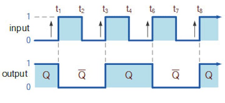 但是我們的二進(jìn)制計(jì)數(shù)器需要一些更復(fù)雜的東西。我們需要一個(gè)撥動(dòng)觸發(fā)器。切換觸發(fā)器具有單個(gè)輸入。給它一個(gè)脈沖,它就會(huì)鎖存。再給它一個(gè)脈沖,它就會(huì)解鎖。它基本上除以二。