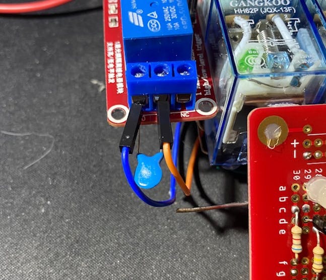 首先,在我們繼續(xù)之前,讓我們添加一個(gè)計(jì)數(shù)器。我偶爾會(huì)看到我的柜臺(tái)跳過一個(gè)節(jié)拍。這似乎是第一個(gè)未能鎖定的觸發(fā)器。考慮原因,我得出結(jié)論,繼電器模塊觸點(diǎn)可能會(huì)彈跳。所有機(jī)械開關(guān)在接觸時(shí)都會(huì)有一點(diǎn)反彈,從而增加了數(shù)字“噪音”。所以這可能是原因。我在繼電器模塊的輸出端直接添加了一個(gè) 0.01 mfd 電容器以抑制任何噪聲。當(dāng)它完全解決問題時(shí),我感到很驚喜!