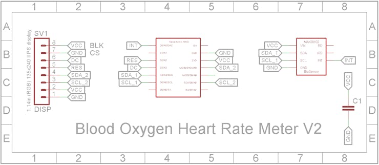 為 Seeeduino XIAO 添加兩個(gè) 8 針接頭。還為顯示器和 MAX30102 模塊添加機(jī)械加工的母頭。0.1uF 單片電容是可選的。它有助于消除饋入 MAX30102 模塊的軌道拾取的任何噪聲。