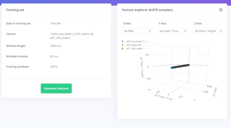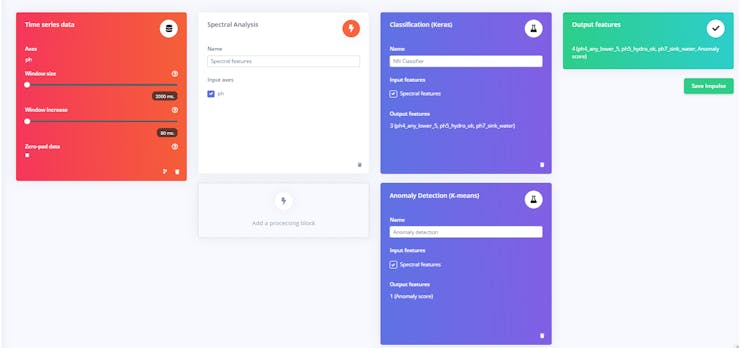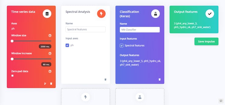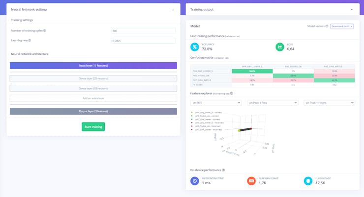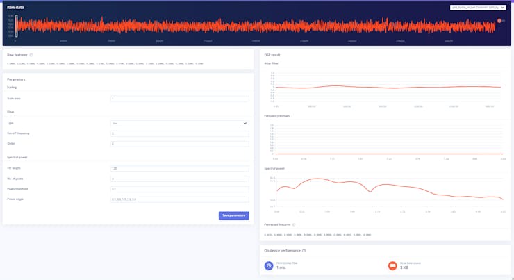 “時間序列數(shù)據(jù)”塊將收集的數(shù)據(jù)拆分為多個選定大小的窗口(在本例中為 2000 毫秒)。“頻譜分析”??塊過濾信號,然后執(zhí)行頻譜分析?!胺诸悺眽K是神經(jīng)網(wǎng)絡(luò),它使用光譜分析的結(jié)果來學(xué)習(xí)如何區(qū)分三個數(shù)據(jù)集。要創(chuàng)建脈沖,我單擊“保存脈沖”,然后轉(zhuǎn)到左側(cè)菜單上的“光譜特征”以查看光譜分析結(jié)果并單擊“保存參數(shù)”。