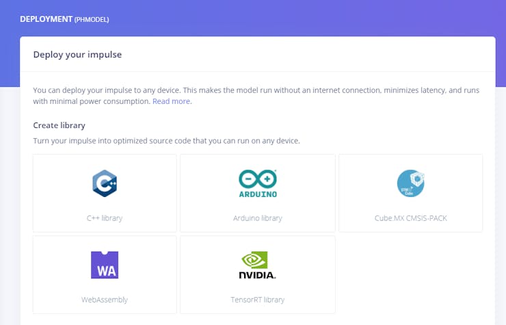 該模型已被證明是可靠的,因此我已將其部署到 Arduino。左側(cè)菜單的“部署”部分幫助我做到了這一點。我可以選擇將沖動部署為庫或固件,我決定創(chuàng)建一個 Arduino 庫,這樣我就可以將它包含在我的草圖中。