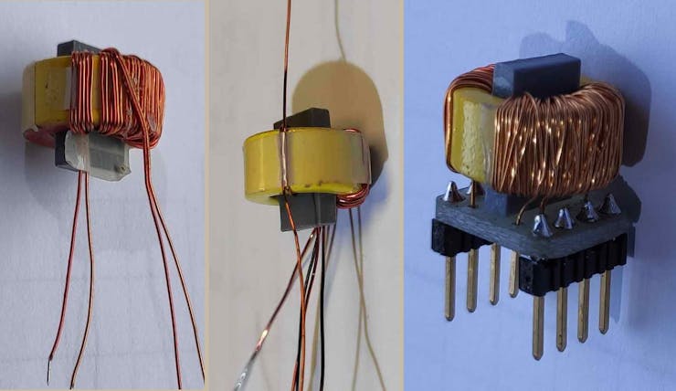 變壓器圍繞從舊 PC 電源回收的黃色 + 紅色環(huán)形線圈(13 x 6.6 毫米 - 7.2 毫米孔)構(gòu)建。測得的 AL 值約為 25-26 nH/N2。2 mm 厚的 PVC 絕緣壁在環(huán)形磁芯中用氰基丙烯酸酯膠合。初級用手纏繞 2 根電線。然后將次級線圈纏繞在自由孔中。絕緣壁最突出的部分粘在一塊穿孔板上,電線連接到引腳。纏繞時(shí),一點(diǎn)膠帶可以幫助將電線固定到位。