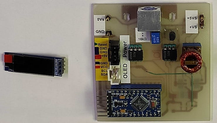 傳感器的 LED 由來自隔離式 DC/DC 轉(zhuǎn)換器的 R1 供電。C3 提供了一條低阻抗路徑,以縮短電線上可能出現(xiàn)的干擾。對于傳感器的輸出,低通濾波由 C4 和 R2+RV2 在 530Hz 左右(RV2 為 0Ω)低至 120Hz(RV2 為 10KΩ)實(shí)現(xiàn)。這為測量至少 7200RPM 留下了空間。該信號由 PNP 晶體管 Q6 放大。然后光耦合器U4將信號傳輸?shù)絘rduino的D2引腳(中斷輸入)。在輸入端,一個(gè) 530 Hz 低通 RC 濾波器 (R12-C13) 消除了剩余的振蕩。速度顯示在 0.91 英寸 I2C OLED(128x32 點(diǎn))上。