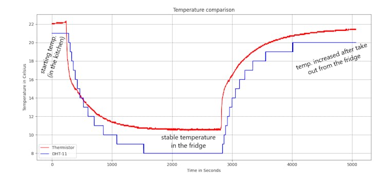 例如:在第 5 秒,熱敏電阻檢測到 21.99 攝氏度,DHT11 檢測到 21.00 攝氏度溫度。(在這個項目中我們不計算濕度)