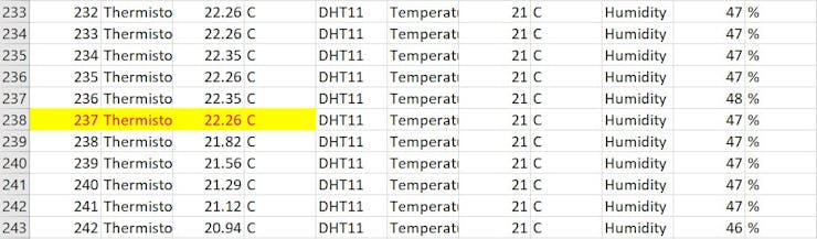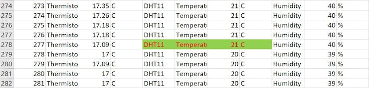 分析來自 DHT-11的數(shù)據(jù):DHT-11 傳感器上的溫度從 277 秒開始下降。