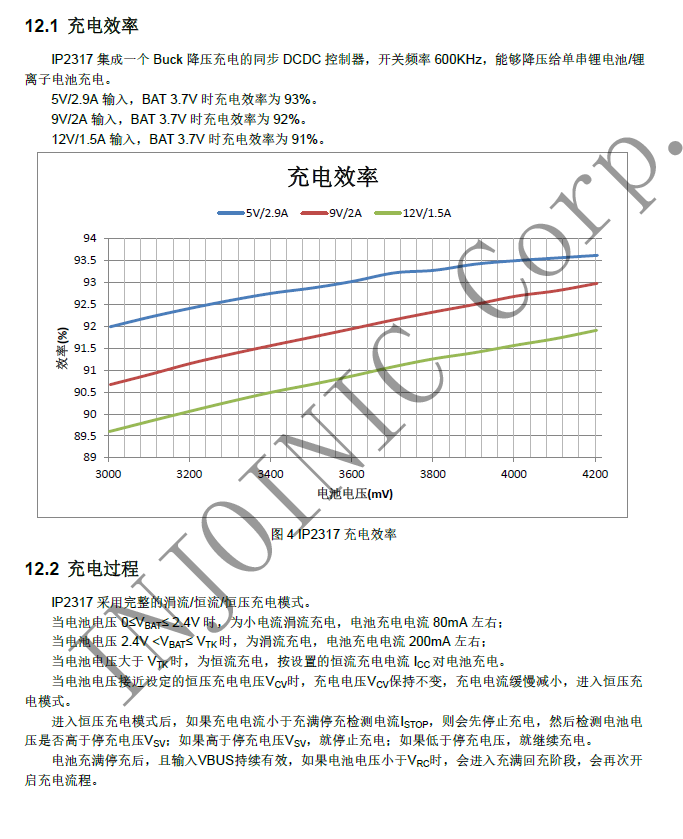 IP2317 輸入電壓范圍 5V~12V,降壓開(kāi)關(guān)充電轉(zhuǎn)換器工作頻率 600KHz;在 VIN=12V,BAT=3.7V, IVBUS=1.5A 時(shí),效率 91%;