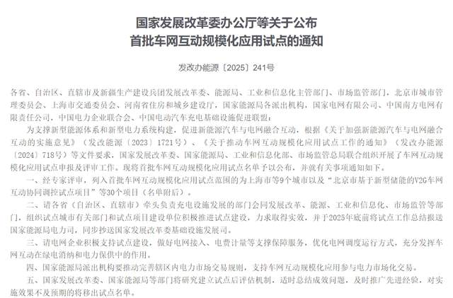 2025 年 4 月,國家發(fā)展改革委、國家能源局等四部委聯(lián)合發(fā)布首批車網(wǎng)互動規(guī)?;瘧迷圏c名單,創(chuàng)新采用 “城市 + 項目” 雙軌推進模式,聚焦新能源汽...