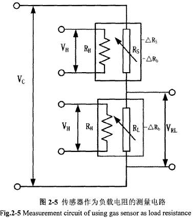 使用同型號的氣敏傳感器作為負(fù)載電阻,如圖2-5所示。-△Rb是檢測傳感器與補(bǔ)償傳感器受溫濕度等環(huán)境干擾影響導(dǎo)致的敏感元件電阻值的變化值。由于用于補(bǔ)償?shù)膫鞲衅髅舾性佑|被測氣體后同樣會(huì)產(chǎn)生電阻值變化,因此需要設(shè)法使補(bǔ)償傳感器與被測氣體隔絕而只感受環(huán)境的變化。
