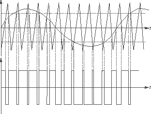 圖2??? 放大器中的三角波、音頻正弦信號產(chǎn)生的PWM波形及其相互關系