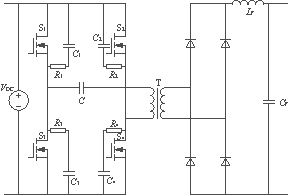 ??? 主電路如圖1所示,功率開(kāi)關(guān)管S1~S4組成逆變橋,S1、S4和S2、S3由驅(qū)動(dòng)電路以PWM方式控制而交替通斷,將直流輸入電壓VDC變換成高頻方波交流電壓。變壓器副邊電壓經(jīng)全橋整流、Lf及Cf濾波后,輸出穩(wěn)定的直流電壓。