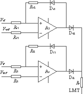 ??? 電路如圖3所示,A1和A2是兩個(gè)運(yùn)算放大器,Vref是基準(zhǔn)電壓,VV和VI分別是反饋電壓和反饋電流信號(hào)。其工作原理是:當(dāng)負(fù)載電流還沒(méi)有達(dá)到Viref值時(shí),運(yùn)放A1處于調(diào)節(jié)狀態(tài),A2輸出高電平,二極管D反向截止,此時(shí)誤差放大器的輸出只受A1控制,處于恒壓調(diào)節(jié)過(guò)程。當(dāng)VV>VVref時(shí),誤差放大器的輸出低電平,當(dāng)VV 圖3??? 恒壓限流電路