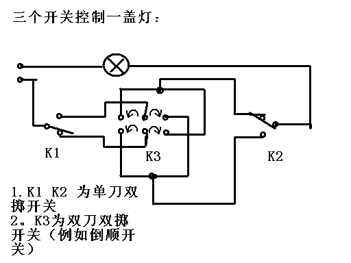 本人見到本站的雙聯(lián)雙控開關(guān)接法,本人也想把自家中自作的雙聯(lián)三控開關(guān)寫出來,也許有的同志象我一樣在家中用到:三個位置控制一盞燈。