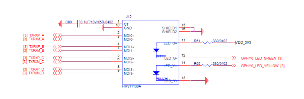 核心板上放置了一顆工業(yè)級千兆以太網芯片 RTL8211FI-CG,以太網芯片與 ZYNQ 芯片之間通過 RGMII 接口互聯(lián),連接對應管腳見下表,以太網對外連接只需要一個 帶變壓器的 RJ45 即可使用,芯片地址 PHY_AD[2:0]=001,連接原理圖可參考下圖(產 品電路需加 ESD 保護電路)。另外, 在實際產品應用中,C80 需要使用高耐壓電容, 如 0.1uF/2KV。