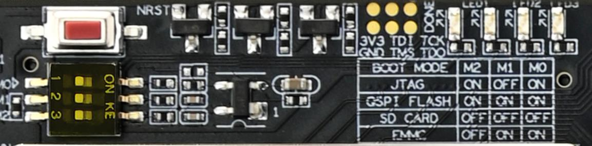 核心板支持四種啟動模式,分別是 JTAG、QSPI Flash、EMMC 、SD 卡。板載了 前三種啟動方式,SD 卡方式用戶可以通過在底板上連接實現(xiàn)。四種啟動方式可以通 過板載的撥碼開關來選擇。如下圖已列出各個模式撥碼開關所在的位置。因主芯片 發(fā)熱量較大,所以在核心板上需要加散熱片,會遮擋 BOOT MODE 選擇表格。