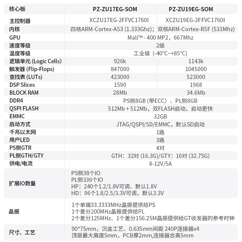 開發(fā)板采用了核心板扣接底板的方式,對于開發(fā)板的型號取決于使用的核 心板型號。核心板提供 ZU17EG 和ZU19EG 兩款,兩款接口完全兼容,通過更換 核心板方式就可以實現(xiàn)開發(fā)板的型號更換,璞致默認生產 ZU19EG,如用戶需 要 ZU17EG 可以聯(lián)系璞致生產。如下表列出了兩款核心板的參數(shù)以及之間的差 異。
