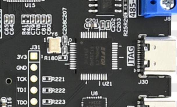 開發(fā)板板載了一個 USB 轉 JTAG 下載器,安裝好 Vivado 軟件后使用 USB 線連接 好 JTAG 對應的 USB 口,即可實現(xiàn)調試下載,非常方便。如下是接口在開發(fā)板上的位 置圖。