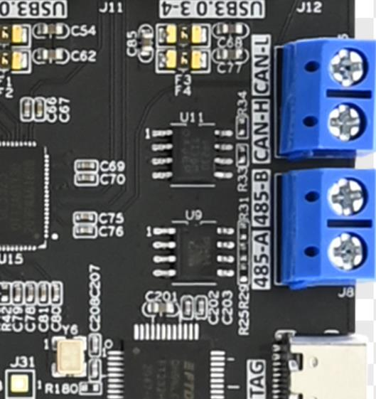 核心板通過四個0.635mm 間距 240P 高速連接器扣接在底板上,使用上更加靈 活。既可以做學習使用,也可以使用核心板用于項目開發(fā)。