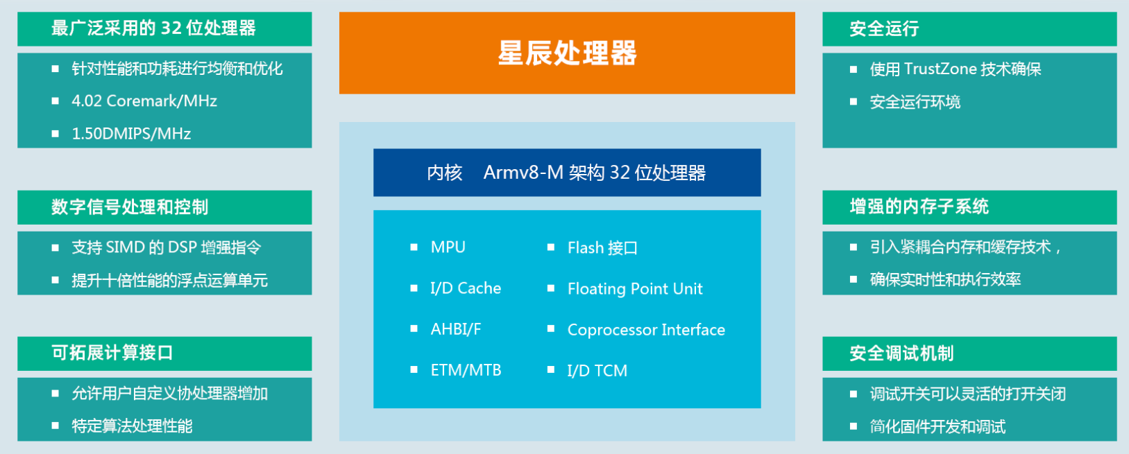 技術(shù)亮點(diǎn)包括:1、Armv8-M架構(gòu),帶來(lái)高達(dá)4.02Coremark/MHz的極致能效;2、內(nèi)存子系統(tǒng)引入緊耦合內(nèi)存和緩存技術(shù),確保實(shí)時(shí)性和執(zhí)行效率;3、DSP指令和協(xié)處理器,幫助實(shí)現(xiàn)算法性能的大幅度提升;4、TrustZone技術(shù),確保物聯(lián)網(wǎng)設(shè)備的信息安全。