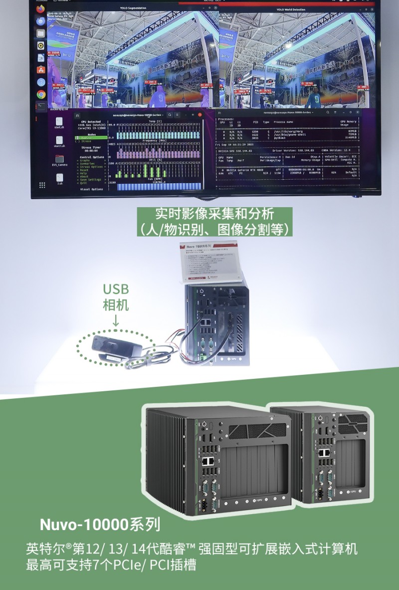 展臺上還展出了更多適用于智慧軌道交通及嚴苛環(huán)境的強固型嵌入式計算機和圖像采集卡,如通過EN 50155和EN 45545認證的無風扇計算機Nuvo-2615RL和車載計算機Nuvo-9200VTC,提供M12網(wǎng)口且基于NVIDIA? Jetson AGX Orin?的NRU-222S,價格親民的IP66防水型計算機Nuvo-9650AWP,基于NVIDIA? Jetson Orin? NX的輕量級無人機任務計算平機FLYC-300,搭載Jetson Orin? NX系統(tǒng)模塊的智能圖像采集卡PCIe-NX150等。