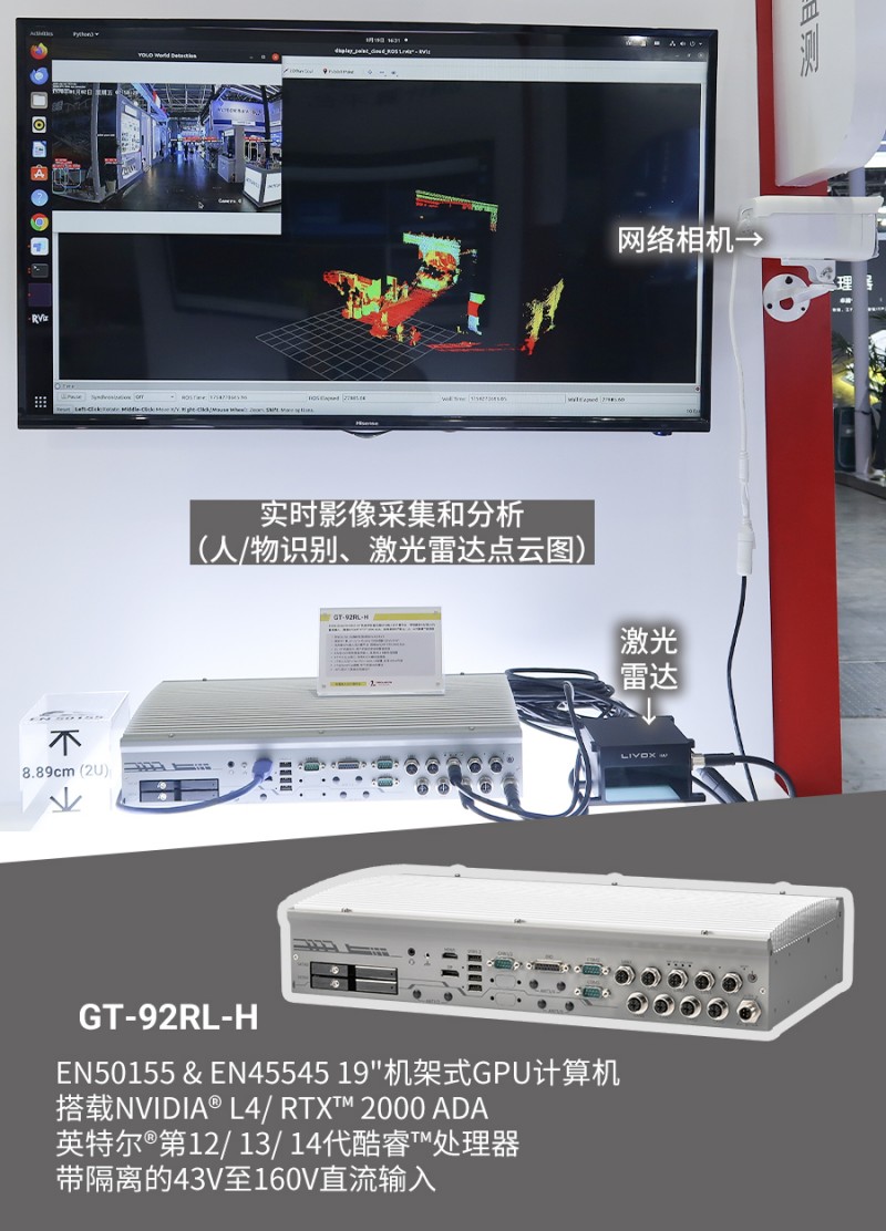 展臺上,GT-92RL-H連接了一個IP相機和一個激光雷達,不僅可以對現(xiàn)場拍攝畫面中的人和物進行實時識別,同時還能呈現(xiàn)激光雷達點云數(shù)據(jù)。