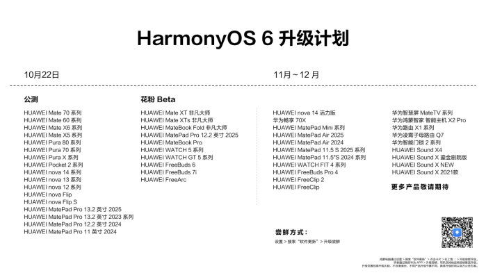 10月22日起,HarmonyOS 6面向首批90多款機(jī)型陸續(xù)開(kāi)放升級(jí)。用戶(hù)可以在系統(tǒng)設(shè)置軟件更新和“我的華為”App首頁(yè)直接申請(qǐng)升級(jí)嘗鮮。加入公測(cè),搶先體驗(yàn)新一代鴻蒙操作系統(tǒng)的強(qiáng)大魅力!