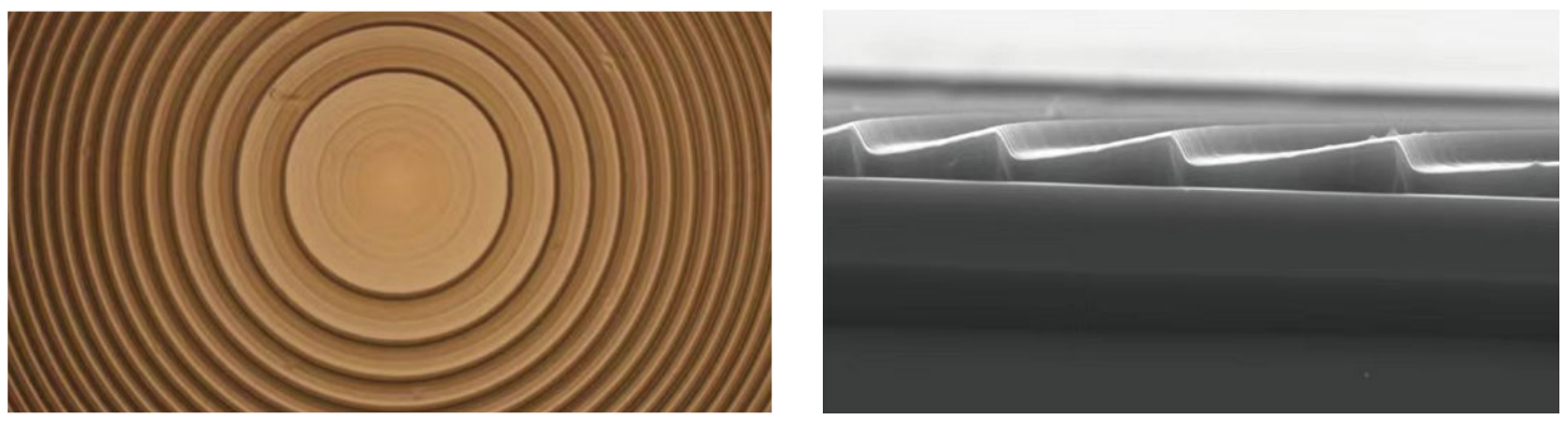 ▲ 灰度光刻菲涅爾透鏡【3D灰度光刻實現(xiàn)菲涅爾透鏡,從掃面電鏡的截面圖中可以看出臺階連續(xù)變化】