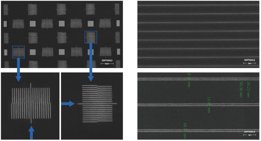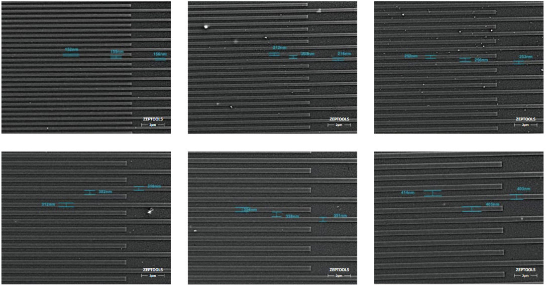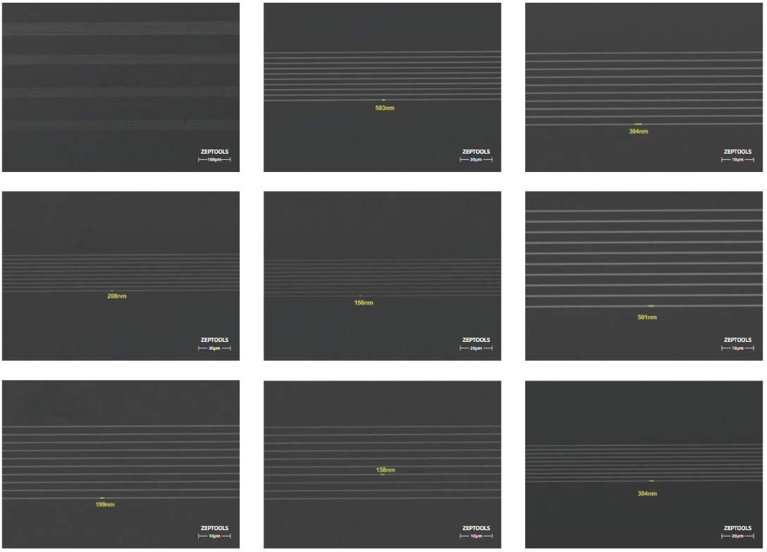 ▲場拼接(游標(biāo)卡尺測量)和最小線寬測試