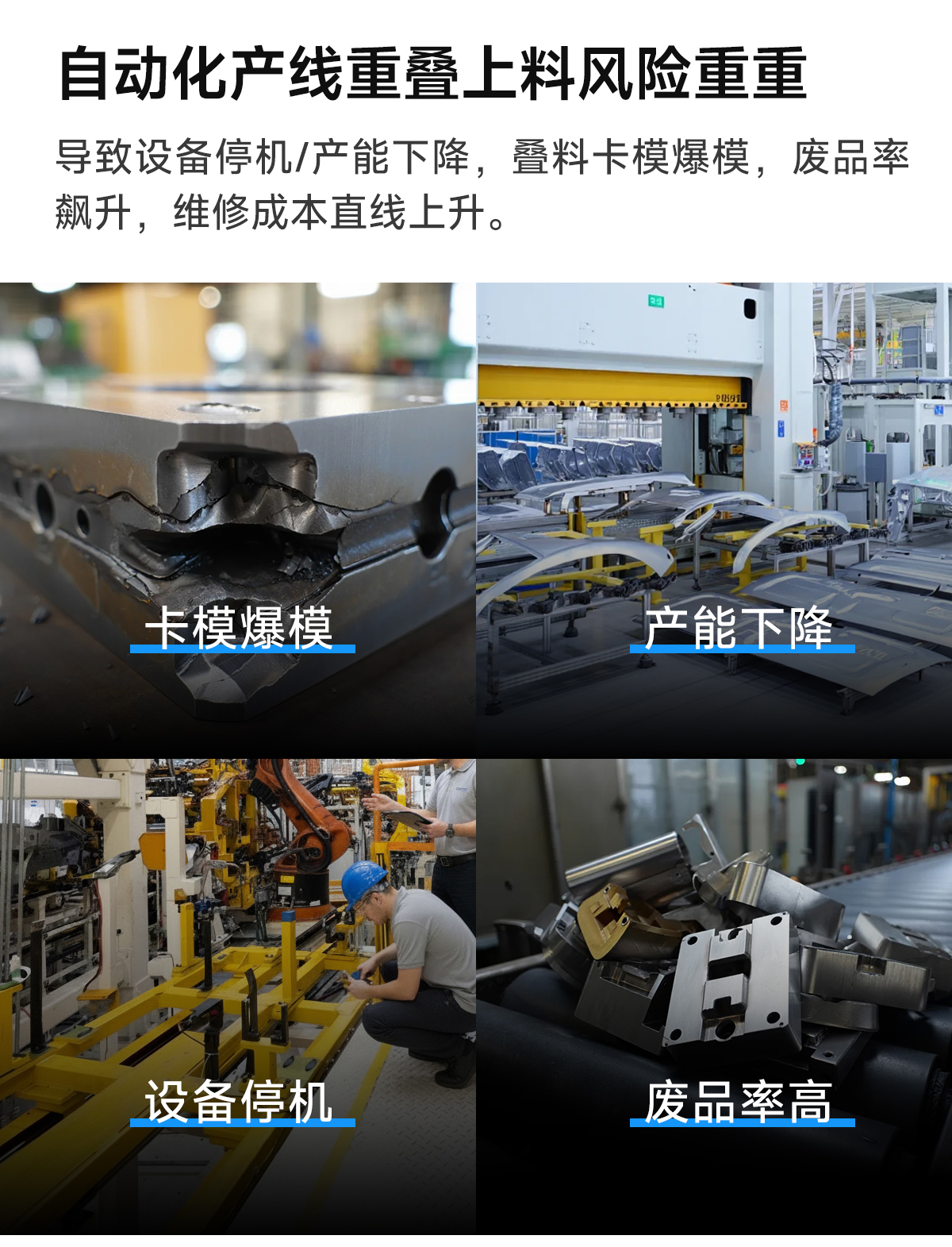 一、汽車零部件產(chǎn)線疊料核心痛點(diǎn)在汽車零部件沖壓、焊接等關(guān)鍵產(chǎn)線中,疊料問題直接影響生產(chǎn)穩(wěn)定性:1.質(zhì)量風(fēng)險(xiǎn):疊料易導(dǎo)致沖壓件尺寸偏差、焊接點(diǎn)虛焊或漏焊,增加次品率,還需額外投入人力篩選,破壞產(chǎn)品一致性。2.成本損耗:疊料會(huì)造成沖壓模具損壞,增加維修費(fèi)用,同時(shí)未及時(shí)檢測(cè)會(huì)導(dǎo)致材料浪費(fèi),推高生產(chǎn)成本。3.效率下降:疊料引發(fā)的設(shè)備故障會(huì)導(dǎo)致產(chǎn)線停機(jī),打亂生產(chǎn)節(jié)奏, -