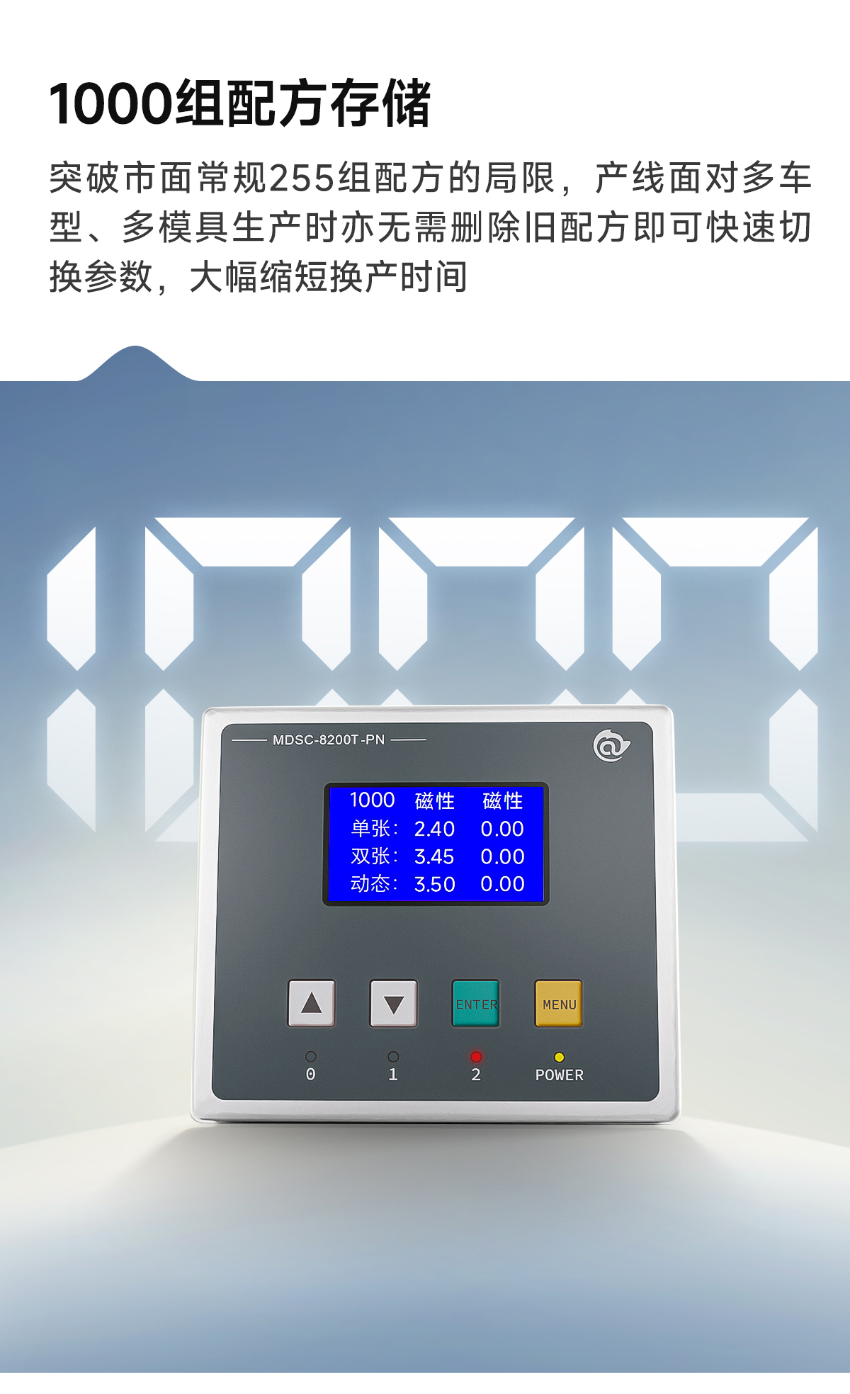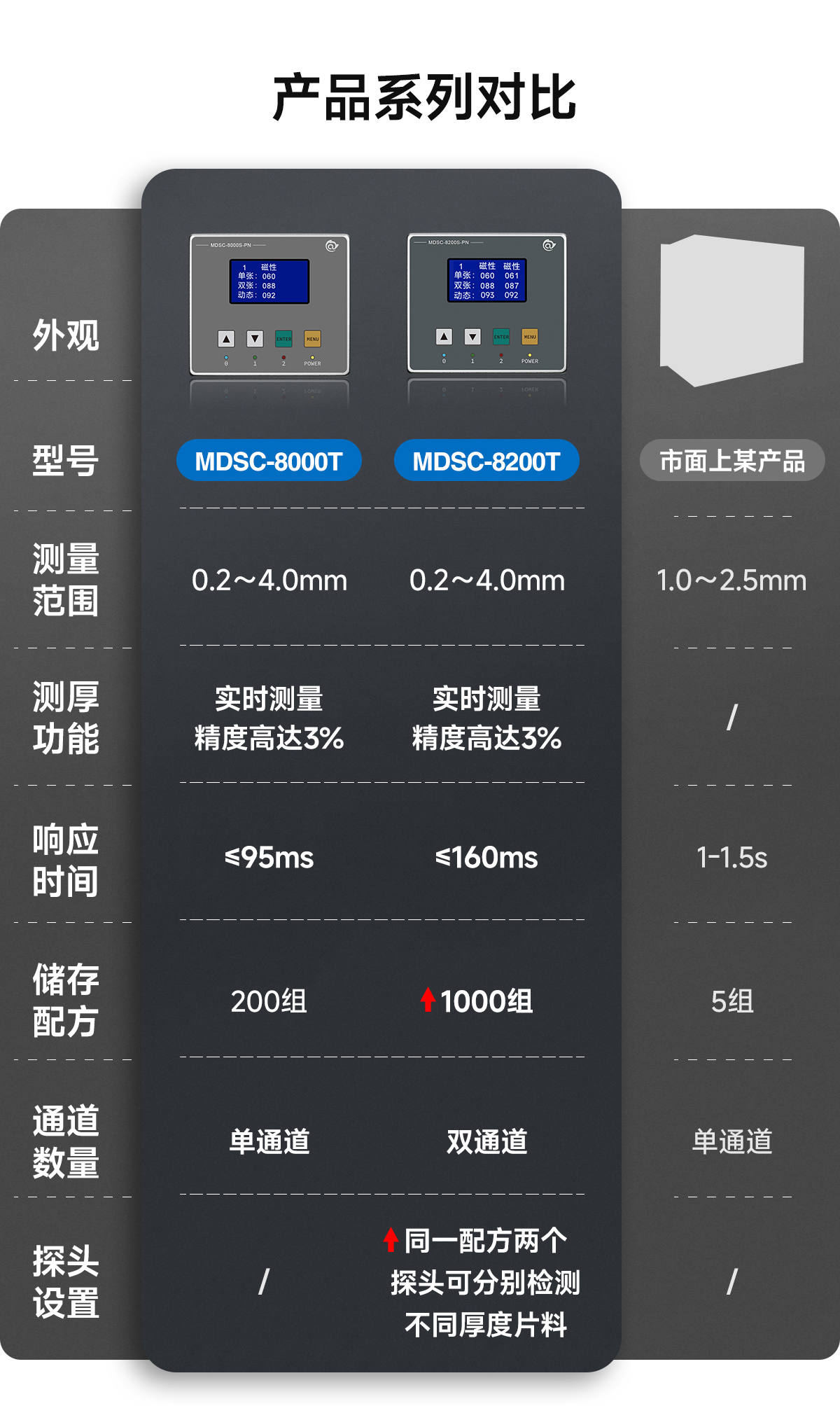 產(chǎn)品型號(hào):MDSC-9000S 檢測(cè)厚度(磁性材 ):0.2-4.0mm 檢測(cè)厚度(費(fèi)道慈):0.2-3.0mm 尺寸:178 x 173 x 67(mm) 特性:200組片料儲(chǔ)存配方 特色:一拖二設(shè)計(jì) -