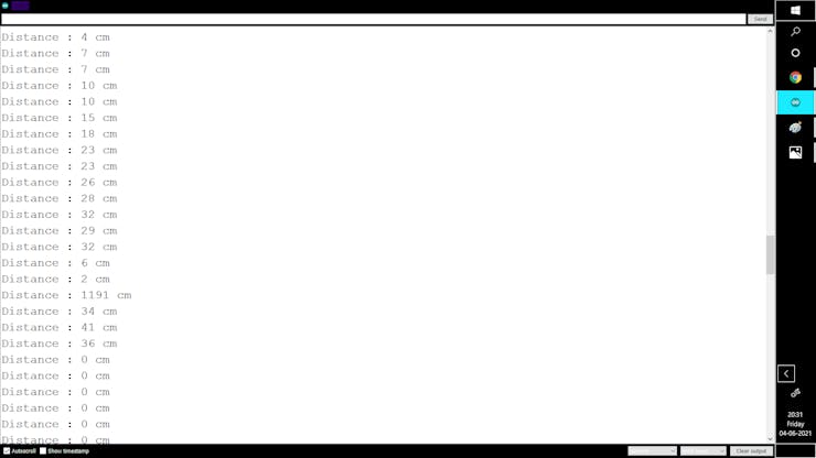 上傳代碼后檢查軟件的右上角你會發(fā)現(xiàn)一個放大鏡圖標(biāo)和。單擊該選項(xiàng),您將獲得超聲波傳感器的值。例如:距離:3 厘米,表示物體距離傳感器 3 厘米。這稱為串行監(jiān)視器,主要用于顯示傳感器的值。
